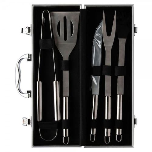- Kit Churrasco Em Aço Inox - 1 Faca -1 Garfo - 1 Pegador - 1 Pincel -1 Espátula -1 - Maleta