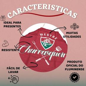 Kit Churrasco Avental Fluminense Mestre Churrasqueiro + Taça Windsor Força Gloria Tradição Oficial Detalhes Com a família ou com os amigos, o avental do Fluminense com estampa MESTRE CHURRASQUEIRO é ideal para os apaixonados pelo Fluzão, na cozinha ou preparando o churrasco com a galera. Feita em poliéster, a peça traz design na cor grena destonada, além de trazer o escudo do time estampado na região frontal.