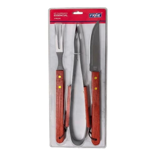 Kit para churrasco Fixxar Essencial, composto por 03 peças de cabo de madeira e aço inoxidável que garante melhor corte e maior durabilidade do produto.Itens inclusos:- 1 Faca 36 cm- 1 Garfo 35 cm- 1 Pegador / Pinça 34 cm- Espessura: 1mmDiferenciais:- Kit completo com 03 peças;- Tudo que você precisa para preparar aquele delicioso churrasco está nesse kit;- Peças produzidas em aço inoxidável com cabo de madeira que garante maior durabilidade para o produto;- Design moderno e inovador;- Ótima opção de presente para aniversário, dia dos pais, dia dos namorados, presente para sogro, presente para filho e demais churrasqueiros;Medidas aproximadas da embalagem:41 x 17 x 5 cmPeso aproximado da embalagem:380 gramasEmbalagem:Blister duplo