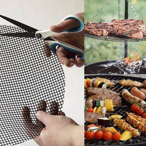 - Tela antiaderente teflon - Tela para altas temperaturas - Kit faca + garfo para churrasco com cabo longo - Dimensões da tela 33x40cm - Dimensões garfo e faca 35cm - A manta antiaderente pode ser cortada em outros formatos - Manta utilizada em churrasqueiras, airfyer, forno e etc..