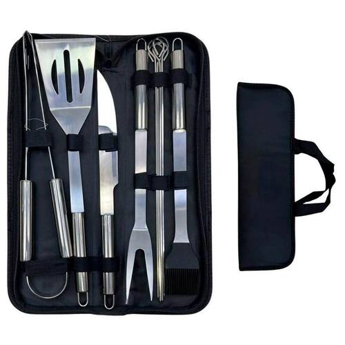 O conjunto vem com 10 peças. Ideal para ter na sua churrasqueira, não sendo necessário procurar cada utensílio na hora de preparar um delicioso churrasco.