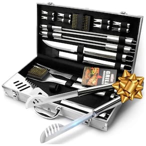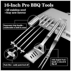 O KIT MAIS COMPLETO Este utensílios para churrasco inclui 1 pinça, 1 garfo, 1 faca, 1 escova de grelha, 1 escova de alinhavo, 4 espetos, 8 suportes de milho, 1 cabeça substituível de escova de grelha e 1 espátula que possui 4 funções com no abridor de garrafas e lâminas amaciantes. Este é um acessório de grelha completo e profissional que contém quase tudo que você precisa para grelhar. MATERIAL PREMIUM Os utensílios de churrasco Grillart são feitos de aço inoxidável de nível profissional que resiste ao calor e resiste ao teste do tempo. Ao contrário dos utensílios feitos de madeira ou metais de qualidade inferior, os nossos não racham, enferrujam ou queimam DESIGN ESPECIAL Fácil de usar é o nosso principal objetivo de design. As pinças de churrasco reforçadas podem facilmente cortar alimentos e não são fáceis de dobrar. A espátula é uma multiferramenta 4 em 1, que inclui virador ranhurado com lâminas amaciadoras e abridor de garrafas embutido. Alças de aço inoxidável alongadas mantêm suas mãos a uma distância segura da chama enquanto você grelha. Anéis pendurados na parte superior de cada alça facilitam o zenamento durante o período de entressafra. PORTÁTIL E CONVENIENTE Nosso conjunto de ferramentas para grelha vem com uma delicada caixa de alumínio para fácil zenamento e transporte. A maleta de transporte aluminosa é leve e garante o zenamento adequado das ferramentas e a fixação das ferramentas em sua localização exata. Você pode carregá lo facilmente Marca: Não Informado