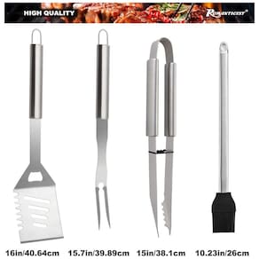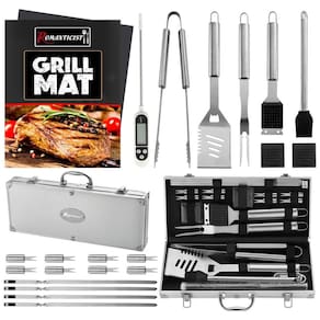 Conjunto Completo de Acessórios para Churrasqueiras Espátula, garfo, pinça, pincel para regar, termômetro de carne, escova para grelha, 2 cabeças de escova para grelha, 2 esteiras para grelha, 8 suportes para milho, 4 espetos, caixa de alumínio. Utensílios de churrasqueira superiores e duráveis Todos os acessórios para churrasco são feitos de aço inoxidável de nível profissional que resiste ao calor e resiste ao teste do tempo. Conjunto de churrasco portátil e conveniente para grelhar ao ar livre O kit de tamanho compacto é leve para transportar, perfeito para camping, piqueniques e moradores urbanos. Idéias de Natal perfeitas para todos em sua lista Este conjunto de ferramentas de grelha de luxo com estojo pode ser absolutamente feito para apresentação de presentes para familiares e amigos no Natal Marca: Não Informado