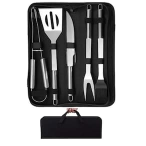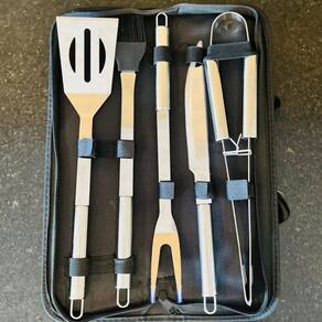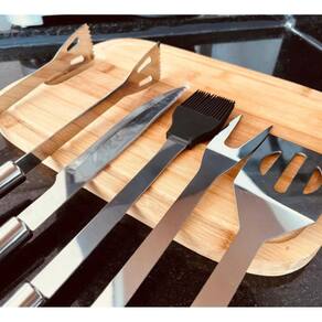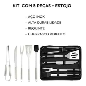 - Marca: Clink - Componentes: aço inox. - Medias de todos os produtos: Compr 33cm x larg 2cm. - O kit contem: 1 pegador, 1 garfo, 1 faca, 1 espátula, 1 pincel e uma maleta. Marca: Não Informado