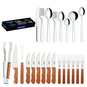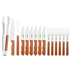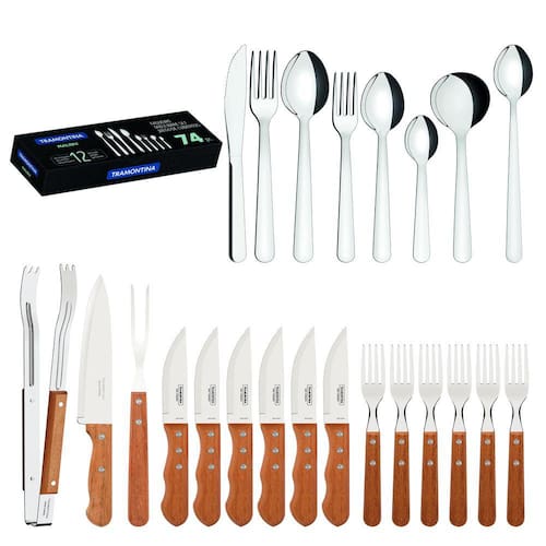 Kit para Churrasco Tramontina Dynamic 15 peças Aço Inox com MadeiraO churrasqueiro é sempre o último a sentar à mesa. Mas para garantir que os convidados também tratem o assado com respeito, nada melhor doque escolher os talheres certos para isso. A linha Churrasco da Tramontina tem cabos de madeira, que resistem ao tempo e à umidade, e lâminasem aço inox para garantir o corte perfeito das carnes.Características• Lâminas de aço inox.• As lâminas das facas têm maior durabilidade do fio devido ao tratamento térmico.• As lâminas dos garfos e pegador para carne contam com maior espessura e uma estampagem do aço que garante maior resistência, evitandodeformações.• Os cabos são de madeira natural.• Rebites de alumínio.Conteúdo da Embalagem1 - 22315008 Faca Chef 8" Dynamic6 - 22342005 Faca para Churrasco Jumbo 5" Dynamic6 - 22343000 Garfo Jumbo Dynamic1 - 22330000 Garfo Trinchante Dynamic1 - 26400000 Pegador para Carne ChurrascoGarantia do Fabricante- 90 dias para vícios ou defeitos de fabricaçãoFaqueiro Aço Inox Tramontina Malibu 74 peçasOs talheres são produzidos em aço inox que mantém a beleza, a higiene a durabilidade.As lâminas das facas têm maior durabilidade do fio devido ao tratamento térmico. Os garfos e colheres garantem maior resistência devido a espessura do aço e a estampagem das lâminas.Podem ir à máquina de lavar louças facilitando seu dia a dia.Componentes:12 facas churrasco de mesa 23730/00412 garfos de mesa 23742/00012 colheres de mesa 23743/00012 garfos de sobremesa 23735/00012 colheres de sobremesa 23756/00012 colheres de café 23738/00001 colher de refresco 23740/00001 colher redonda 23739/000Certificação:Certificação NSF - Os produtos da Linha Malibu são certificados pelaNational Sanitation Foundation (NSF), organização reconhecida como aautoridade internacional em segurança alimentar e práticas de higiene.Garantia do Fabricante:90 dias contra defeitos de fabricação (ofertada pelo fabricante) Ean: 7891112288034