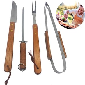 Kit Churrasqueiro 4 Peças Perfeito Para Churrasqueiras Com KIT CHURRASCO 4 PEÇAS O Kit Churrasco 4 Peças é a escolha ideal para quem busca praticidade e qualidade em seus momentos de churrasco. Com cabo em madeira de excelente acabamento e peças feitas em aço inox, este kit completo inclui tudo o que você precisa para preparar o churrasco perfeito. O design anatômico das peças garante conforto e segurança ao manuseio, oferecendo um corte preciso e facilidade no uso. Seja para uso doméstico ou , este kit é indispensável para quem gosta de churrasquear com estilo e eficiência. CONTEÚDO DA EMBALAGEM 01 Garfo com cabo de madeira 01 Faca com cabo de madeira 01 Chaira com cabo de madeira 01 Pegador com cabo de madeira CARACTERÍSTICAS Cabo em madeira de alta qualidade Acabamento perfeito e anatômico Corte preciso com lâminas em aço inox Ideal para churrasqueiros Durabilidade e resistência Kit completo com 4 peças essenciais ESPECIFICAÇÕES Dimensões do item: 30 x 200 x 440 mm Material: Madeira/Aço inox Dimensões das peças: Chaira: 7,5 Garfo: 5 Pegador: 6,5 Faca: 5,5 Peso: 800 g Marca: Não Informado
