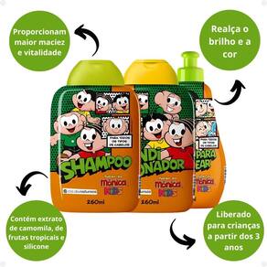 O Kit Turma da Mônica para Todos os Tipos de Cabelos contém extrato de camomila, extrato de frutas tropicais e silicone, que proporcionam maior maciez e vitalidade, além de realçar seu brilho e cor. O shampoo limpa os fios com suavidade, o condicionador ajuda a desembaraçar os fios, deixando os cabelos macios, brilhantes e com cheirinho delicioso, o Creme ajuda a hidratar os fios e a evitar os nozinhos indesejados, deixando os cabelos fáceis de pentear, modelados e brilhantes. Para todos os tipos de cabelo. Não irrita os olhos. Liberado para crianças a partir de 03 anos.
