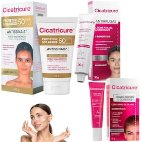 Kit cicatricure facial antissinais protetor contorno olhos Bem vindo a a loja flocus. É um prazer tê-lo a como nosso a cliente Conteúdo: 1 creme facial antissinais cicatricure - 30g 1 creme contorno de olhos rugas, bolsas e olheiras - 15g 1 protetor solar antissinais fps 50 toque seco cicatricure 40 g sem cor Cicatricure é especialista no cuidado com a pele. Uma marca parceira, com soluções eficazes e acessíveis pensadas especialmente para todos aqueles que querem cuidar da pele. Sua exclusiva fórmula com bio-regenext ajuda a recuperar a elasticidade e a firmeza da pele, reduzindo visivelmente as rugas e linhas de expressão. O creme facial cicatricure antissinais possui a tecnologia bio-regenext que transmite informações de uma célula para outra, promove a regeneração natural e repara os danos na pele proporcionando aparência mais jovem. Cicatricure contorno dos olhos reduz o volume das bolsas em 28% aos 15 dias e em 40% aos 30 dias E proporciona olheiras menos visíveis. Sua fórmula de textura leve diminui rugas e linhas de expressão e reduz o volume das bolsas. O novo cicatricure protetor solar antissinais fps 50 de uso diário com ácido hialurônico e pró-colágeno protege a pele do sol, ajudando a prevenir os sinais visíveis do foto-envelhecimento como rugas, linhas de expressão e manchas solares. Com partículas absorvedoras de oleosidade, confere toque seco e matifica a pele instantaneamente. fórmula resistente à água e ao suor. Testado dermatologicamente. Indicação: Todos os tipos de pele. protetor solar com cor somente para peles claras. Benefícios: reduz rugas possui a tecnologia bio-regenext, que recupera o envelhecimento da pele de 2 anos em 2 meses e reduz as rugas profundas; mais firmeza reafirma a pele, com resultados a partir da 1 aplicação; ingredientes a fórmula é rica em glicerina vegetal, óleos, manteigas e extratos vegetais que nutrem e hidratam a pele profundamente favorecendo a maciez e radiância da pele; proteção solar antissinais com ácido hialurônico e pró-colágeno, protege a pele do sol, ajudando a prevenir os sinais visíveis do foto envelhecimento como rugas, linhas de expressão e manchas solares. toque seco com partículas absorvedoras de oleosidade, confere toque seco e matifica a pele instantaneamente. Fórmula resistente à água e ao suor. Modo de uso: 1 passo: creme facial: Aplique pela manhã e à noite no rosto, pescoço e colo sobre a pele limpa e seca. Faça movimentos de baixo para cima até completa absorção. 2 passo: creme contorno de olhos: Utilizar pela manhã e à noite em todo o contorno dos olhos, incluindo a área das pálpebras. Massagear com movimentos suaves desde o interior até o exterior do contorno dos olhos. 3 passo: protetor solar antissinais: Aplique pela manhã e à noite no rosto, pescoço e colo sobre a pele limpa e seca. Faça movimentos de baixo para cima até completa absorção. Aplique abundantemente cicatricure protetor solar fps 50, no mínimo 30 minutos antes da exposição ao sol. Se a quantidade aplicada não for adequada, o nível de proteção será significativamente reduzido. Reaplicar sempre, generosa e frequentemente, quantas vezes for necessário para manter a proteção, especialmente após sudorese intensa, nadar ou banhar-se, secar-se com toalha e durante a exposição ao sol. Agradecemos por escolher a loja flocus e por confiar em nós para cuidar da beleza dos seus cabelos. Em caso de dúvidas, favor enviar sua pergunta Flocus