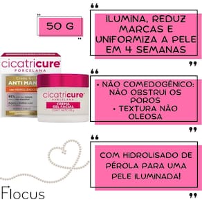 O gel creme facial cicatricure porcelana antimarcas apresenta fórmula que oferece hidratação imediata, resultando em uma pele mais suave e macia desde a primeira aplicação. Promove uma aparência radiante e luminosa, realçando a beleza natural da pele e não obstrui os poros, evitando o surgimento de cravos e espinhas e mantendo a pele saudável. É indicado para uso no rosto, colo e pescoço e formulado com hidrolisado de pérola que ajuda a reduzir marcas e ilumina e uniformiza a pele em apenas 4 semanas.