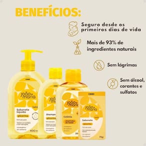 Sabonete Líquido João e Maria: Aplique uma pequena quantidade na palma da mão ou em uma esponja macia, espalhe sobre o corpo do bebê e enxágue em seguida. Dica: Use água morna para um banho mais relaxante e aproveite este momento para fortalecer o vínculo com seu bebê.
