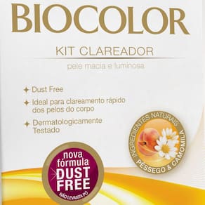 O Kit Clareador Biocolor excelente para descoloração dos pêlos do corpo. Promove uma descoloração uniforme deixando a pele macia, luminosa e com um perfume de pêssego. O Kit contém tudo o que é necessário para permitir ao consumidor descolorir seus pêlos de forma prática e rápida em casa.