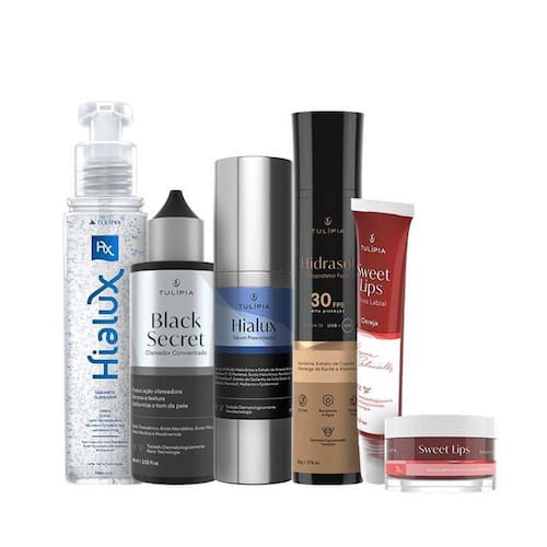 KIT CLAREAMENTO 6 PRODUTOSO Kit Clareamento é o tratamento ideal para uniformizar o tom natural da pele e amenizar manchas de melasma ou causadas pelo sol. Com produtos que se equilibram perfeitamente, este kit irá limpar, hidratar, preencher, clarear manchas, proteger a sua pele do sol e ainda cuidar dos seus lábios.Esse kit contém:Hialux Sabonete ClareadorCom ácido hialurônico em sua formulação, promove limpeza e hidrata até as camadas mais profundas da pele, sem causar ressecamento. Possui ação clareadora que ameniza e previne contra o aparecimento de manchas, sem causar irritações. Black Secret Clareador ConcentradoPossui blend de ácidos com ação clareadora e fórmula ideal para cuidados pré-peeling e tratamento de manchas, uniformizando o tom natural da pele enquanto atua no controle da oleosidade excessiva.Hialux Sérum PreenchedorSérum com 5 tipos de ácido hialurônico e fatores de crescimento que promovem preenchimento através da hidratação e firmeza para a pele, garantindo máxima eficácia na hidratação imediata e prolongada.Hidrasol Fotoprotetor Facial FPS 60Contém ativos antioxidantes que protegem contra os radicais livres e previnem o fotoenvelhecimento. Esse é um filtro solar com alto poder de proteção contra os raios UV, livre de óleos e que possui toque seco, sendo ideal para peles sensíveis.Sweet Lips Esfoliante Labial CerejaEsfoliante labial com microesferas esfoliantes com alto poder de abrasão, que promovem renovação celular, retirando as células mortas. O resultado são lábios macios, rejuvenescidos e hidratados, com sabor e aroma irresistíveis de cereja.Sweet Lips Gloss Labial CerejaGloss labial com sabor e aroma de cereja, que possui potente ação hidratante e recupera a textura dos lábios, promovendo maciez e sensação momentânea de volume, sem deixar os lábios pegajosos.BenefíciosHialux Sabonete ClareadorPromove limpeza e hidratação profunda, sem ressecar a pele;Auxilia no clareamento de manchas e suaviza os sinais do envelhecimento;Recupera a textura macia e aveludada da pele.Black Secret Clareador ConcentradoPossui ação clareadora que uniformiza os tons naturais da pele;Potencializa o rejuvenescimento e suavizando rugas e linhas de expressão;Renova a textura natural da pele.Hialux Sérum PreenchedorSuaviza linhas de expressão e previne os sinais do envelhecimento;Promove preenchimento através da hidratação imediata e prolongada;Possui efeito tensor e firmador, que recupera a textura e a maciez da pele.Hidrasol Fotoprotetor Facial FPS 60Com textura soft cream e toque seco, se funde com a pele no momento da aplicação;Possui máxima eficiência em fotoproteção contra os raios UV, protegendo a pele contra o fotoenvelhecimento.Indicado para todos os tipos de pele, oferece alta espalhabilidade, sem deixar resíduos brancos.Sweet Lips Esfoliante Labial Cereja Estimula a renovação celular, recuperando a textura macia dos lábios;Promove hidratação e nutrição labial, proporcionando uma cor suave e bonita;Combate o envelhecimento precoce dos lábios.Sweet Lips Gloss Labial CerejaPromove hidratação profunda sem deixar os lábios pegajosos;Ideal para lábios ressecados, desvitalizados e sem definição de contorno;Reduz rugas verticais e restaura a textura e o volume labial.