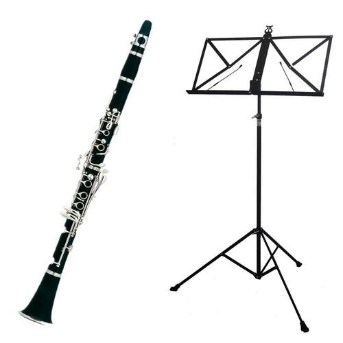 O Clarinete soprano modelo standard da New York é banhado a níquel possui corpo em baquelite parafusos em aço inoxidável e acabamento brilhante. É um instrumento ideal para iniciantes que desejam alcançar um melhor desempenho. Acompanha estante de partitura dobrável estilo vazada, fácil de moldar como quiser. Possui regulagem de altura de 2 estágios, pés emborrachados que garantem a firmeza no apoio. Conta ainda com acabamento em epoxi, estrutura reforçada e presilhas para que a folha fique no lugar além de ser resistente e compacta.