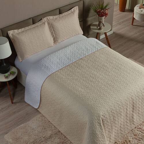 Kit Cobre Leito Casal Queen Size 3 Peças Matelado Dupla Face Acabamento Viés Debrum - Cáqui