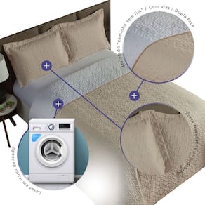 - Design Sofisticado: Este cobre leito é meticulosamente matelado, criando um padrão de caminho sem fim que confere um toque de sofisticação à sua cama. Além disso, os porta travesseiros apresentam um elegante debrum que completa a decoração com estilo;