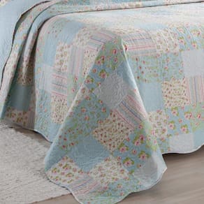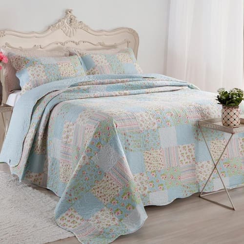 Kit Cobre Leito Colcha Daily Casal 3 Peças Dupla Face Estampado Floral Patchwork Azul 10 100% Poliéster