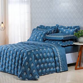 Kit Cobre Leito Colcha Super King 100% Algodão 400 Fios Acetinado Bordado 5 Peças Azul Marinho - Única