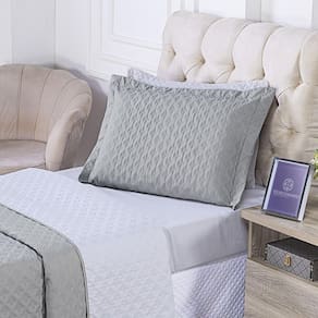 Design Sofisticado: O cobre leito e o porta travesseiro são adornados com um bordado moderno que cria uma textura única e um visual luxuoso.