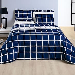 Kit Cobre Leito Minimalista Quadriculado Queen 03 Peças Tecido Micropercal 200 Fios - Marinho Com Branco