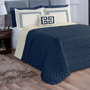 Kit Cobre Leito Queen Grecco Azul Marinho Casaborda 5 Peças O Cobre Leito Grecco é um produto completo, composto por 5 peças, dupla face e matelado. Lindo, moderno e com design super atual. Confeccionado na parte superior, inferior e enchimento com 100% poliéster. O porta travesseiro e almofada também são confeccionados em 100% poliéster. Os porta tarvesseiros possuem estampas clássicas.Composição:1 cobre leito 2,60m x 2,40m4 porta travesseiros 75cm x 55cm1 capa de almofada 35cm x 35cm1 refil de almofada 35cm x 35cm Tamanho - Queen