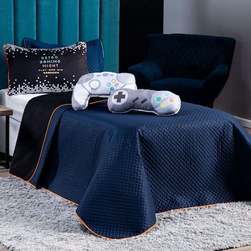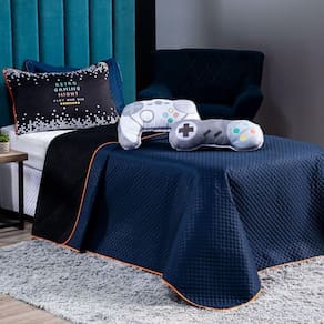 Confeccionado em tecido Microfibra Poliéster, a nova Coleção Retro Game vem trazendo um toque macio, com portas em acabamento debrum, o cobre leito com enchimento em manta dupla face, permitindo o uso dos dois lados (Azul Marinho e Preto), com lindos detalhes nos porta-travesseiros estampados com viés em toda a volta, tudo para combinar com a sua decoração Gamer! Acompanhando também duas lindas almofadas em formato de controles de videogames antigos para sentir aquela nostalgia ao entrar no quarto, todas estampadas digital e com enchimento em silicone. Produzido num rigoroso controle de qualidade, dando um toque de requinte para o ambiente. Confira!