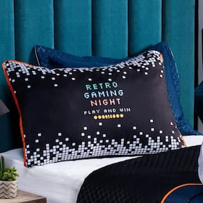Confeccionado em tecido Microfibra Poliéster, a nova Coleção Retro Game vem trazendo um toque macio, com porta em acabamento debrum, o cobre leito com enchimento em manta dupla face, permitindo o uso dos dois lados (Azul Marinho e Preto), com lindos detalhes no porta-travesseiro estampado com viés em toda a volta, tudo para combinar com a sua decoração Gamer! Acompanhando também duas lindas almofadas em formato de controles de videogames antigos para sentir aquela nostalgia ao entrar no quarto, todas estampadas digital e com enchimento em silicone. Produzido num rigoroso controle de qualidade, dando um toque de requinte para o ambiente. Confira!