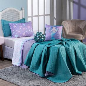 Confeccionado em tecido Microfibra Poliéster, a nova Coleção Sereia Tiffany vem trazendo um toque macio, com portas em acabamento debrum, o cobre leito com enchimento em manta dupla face, permitindo o uso dos dois lados (Tiffany e Lilás), tudo para combinar com a sua decoração! Acompanhando uma linda almofada de nó em malha furtacor com enchimento silicone e também uma capinha de almofada quadrada estampada digital com zíper. E para completar sua decoração, desenvolvemos os porta-travesseiros estampados em dupla face, podendo utilizar tanto o lado estampado Tiffany quanto o lado estampado Lilás, para montar a cama do seu jeito! Produzido num rigoroso controle de qualidade, dando um toque de requinte para o ambiente. Confira!