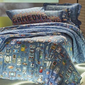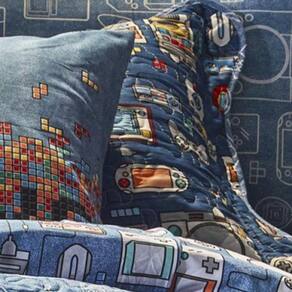 Características Composição: 50% Algodão 50% Poliéster Enchimento: 30% Algodão 70% Poliéster Acabamento: Micromatelassado Costurado e com Viés Detalhe com Frame e Porta Travesseiro com 3 Abas Dupla Face Estampa: Play Contém 02 peças Cor predominante: Azul Tamanho: Solteiro