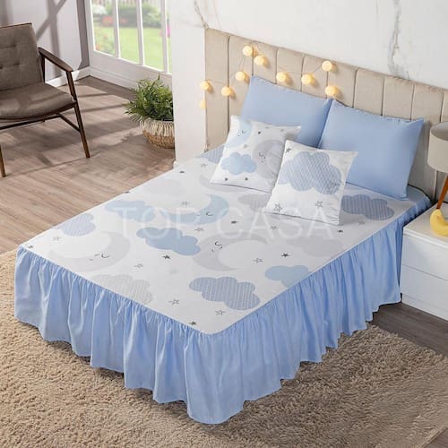 Kit Colcha Cobre Leito Casal 5 Peças Estampado Infantil Quarto Nuvem Azul Colcha temática com estampa digital, de alta qualidade, levando charme e Durabilidade para o quarto. Descrição produto: 01 - Colcha : 2,60 x 2,70 Com Babado e Bainha 02- Fronha : 50 x 7002- Capa de Almofada : 45x 45 Modelo Envelope Composição :100% PoliésterTecido: Poliéster 160 Fios Sobre este itemExcelente custo benefício FABRICAÇÃO PROPRIA. Marca: Moro Confecções