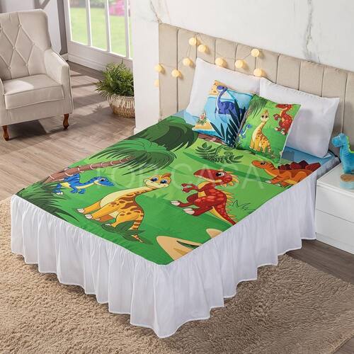 Kit Colcha Cobre Leito Casal Padrão 5 Peças Estampado Infantil Quarto Vale dos Dinossauros Colcha temática com estampa digital, de alta qualidade, levando charme e Durabilidade para o quarto.