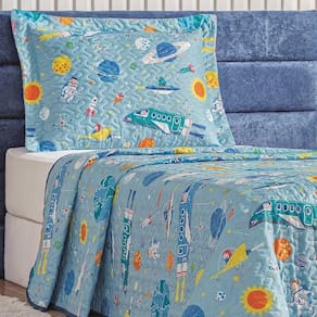 Com estampas temáticas de astronautas, foguetes, estrelas e planetas, a colcha traz toda a magia do universo para o quarto do seu filho. Além disso, o kit é dupla face, o que permite alternar entre diferentes estilos e visuais, proporcionando versatilidade na decoração.