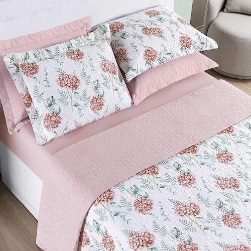 Kit Cobre Leito Colcha Maris Queen Estampado Dupla Face Percalle 200 Fios 3 Peças Hortênsia Salmão