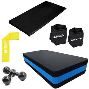 Kit composto por: 1- colchonete 90x45x2 cm 1- par de caneleira de 2 kg 1- step de eva 60cm x 28cm x 10cm 1- par de halter emborrachado 3kg 1- mini band leve