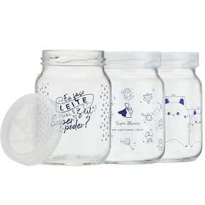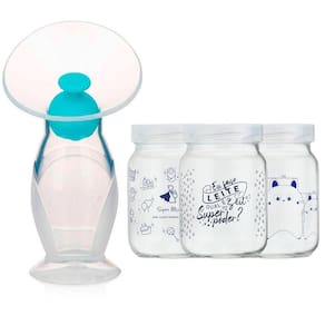 Kit com 1 Coletor de Leite Materno em Silicone com Tampa Nûby e mais 3 Potes de Vidro de 200ml para Armazenar Leite Materno Decorados