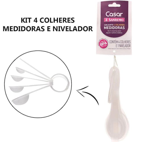 Kit colher medidora plástico atóxico 4 cl nivelador sanremo jogo 4 colheres medidoras + nivelador plástico sanremo O conjunto de colheres medidoras com 5 peças da sanremo é feito para você acertar nas receitas e não passar das medidas. São quatro colheres e um nivelador que alinha o conteúdo e indica a medida com precisão. Esse kit não pode faltar na cozinha de quem adora uma receita ou então de quem trabalha com gastronomia e além de tudo, é fácil de lavar Conjunto de colheres medidoras plásticas sanremo. 1 colher 15ml 1 cl sopa . 1 colher 7,5ml cl sopa . 1 colher 5ml 1 cl chá . 1 colher 2,5ml cl chá . 1 nivelador. Garanta já seu kit