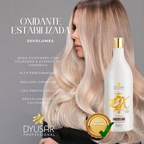 As oxidantes estabilizadas ou água oxigenada da dyusar professional possuem fórmula estabilizada, cremosa e perfumada, além de proporcionar uniformidade e brilho. Modo de uso: misturar a emulsão oxidante com a tintura ou descolorante, conforme as proporções de diluição aconselhadas para cada tipo de produto. Cuidados: contém substâncias passíveis de causar alergia na pele. Antes de usar, faça a prova de toque. Não usar nos cílios e sobrancelhas pois pode causar irritação nos olhos ou cegueira. Não aplicar se o couro cabeludo estiver irritado ou lesionado. Em caso de contato, enxaguar com água abundantemente. Manter fora do alcance das crianças. Evitar exposição ao sol. Contém peróxido de hidrogênio. Usar luvas adequadas. Usar luvas apropriadas. Respeitar o tempo de pausa. Não utilizar ferramentas metálicas. Tempo de uso: até 50 minutos. Este produto deve ser utilizado apenas por um cabeleireiro. Prova de toque: aplicar pequena quantidade no antebraço ou atrás da orelha. Deixar sobre a pele uma hora. Em seguida enxaguar o local. Aguardar 24 horas. Caso surja sinais de irritabilidade, não utilizar o produto.