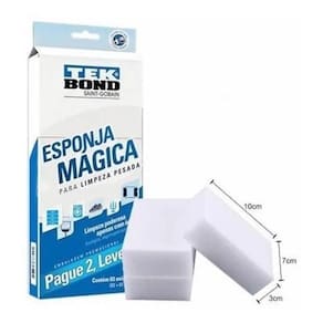 ESPONJA MÁGICARemove manchas, riscos e sujeiras de lápis de cor, pincel âtomico, marcas antigas de mãos em paredes, vidros, espelhos, cerâmicas, pisos e mesas de madeira, espelho de tomadas e interruptores desde que desenergizados , manchas de tênis e uma série de outros resíduos.VANTAGENS Limpa apenas com água, sem a necessidade de agentes químicos ou produtos de limpeza; Produto ecológico, não agride o meio ambiente; Pouco esforço; Não deixa resíduos;MODO DE USO:1. Umedeça a esponja e aperte com as mãos espalmadas, para remover o excesso de água.2. Esfregue a espuma sobre o risco e/ou mancha da superfície a ser limpa. Ao final do processo, a umidade pode ser removida com uma toalha seca e limpa.3. Para remover as impurezas da esponja após a aplicação, enxágue em água corrente, remova o excesso apertando com as mãos espalmadas e deixe secar. Para preservação das características e eficácia do produto, a esponja não deve ser torcida ou apertada.LIMITAÇÕES DE USONão recomendado o uso de detergente, água sanitária ou qualquer tipo de produto de limpeza. A durabilidade da espuma pode variar de acordo com a pressão, a extensão e o tipo de superfície a ser limpa. É uma esponja descartável e pode ser utilizada até que se desfaça por completo.PRECAUÇÕES:Não é uma substância ou uma mistura perigosa. O produto em contato com a pele pode causar escoriações. Não aplicar na pele ou outras partes do corpo.Atenção: Não indicado para objetos escuros, superfícies polidas ou de alto brilho. Recomendamos sempre o teste em uma pequena área antes de se aplicar em toda a superfície.COMPOSIÇÃO QUÍMICA:Esponja de plástico expandido à base de melamina.Importante Antes da utilização da espuma, recomenda-se realizar um teste de aplicação em uma pequena área. A esponja não é recomendada para ser utilizada em remoção de riscos profundos e manchas em superfícies porosas. Não deve ser utilizada em aquários, lataria de veículos, superfícies polidas, com alto brilho, acetinadas, escovadas, cobre, aço inoxidável, materiais que tenham contato com alimentos, com talheres e panelas.Medida: 100x70x30mmCor: branca