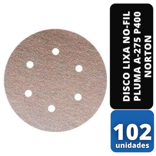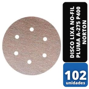 KIT COM 102 DISCO LIXA NO-FIL PLUMA A-275 P400 NEW NORTONO Disco de Lixa Speed-Grip (com pluma) A275 é uma lixa de papel, em formato de disco, com grão óxido de alumínio, conhecida como lixa Champagne, um dos ‘best-sellers’ da Norton. Indicada em operações de lixamento na preparação de superfícies, lixamento de seladoras e vernizes. Possui costado de papel leve ideal para lixamentos manuais ou em máquinas roto-orbitais, e camada especial No-FIl, que reduz o empastamento em operações de lixamento a seco.Gão: P400Abrasivo : Óxido de Alumínio MarromLinha : A275Composição : Abrasivo, papel, tela sintética e adesivoCostado : PapelSeco/Úmido/Ambos : SecoDimensão: 152x0x6mm Furos:06 furosQuantidade: 102 unidadesReferencia: 77696099159Marca: NORTONCódigo:78747*IMAGEM ILUSTRATIVA*