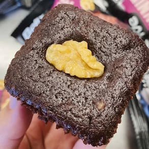 Descrição: Brownies sabor chocolate com nozes, sem glúten, sem açúcar e sem lactose.