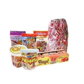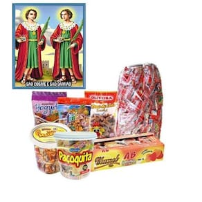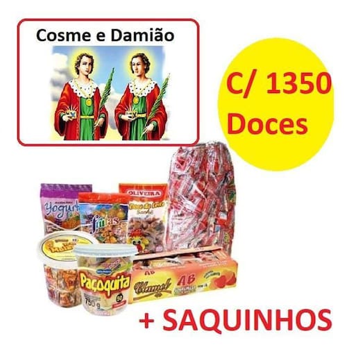 Kit ideal para o dia de Cosme e Damião São 8 tipos diferentes de doces. Acompanha saco para embalarContendo: 3 sacos de pipoca doce contendo 50 unidades cada 3 sacos de geladinho contendo 50 unidades cada 3 pacotes de maria mole contendo 50 unidades cada 3 pacotes de chup chup doce de leite contendo 50 unidades cada 3 pacotes de paçoca contendo 50 unidades cada 3 pacotes de chiclete ou bala contendo 100 unidades cada 3 pacotes de quebra queixo contendo 50 unidades cada 3 pacote de bananada ou pé de moleque contendo 50 unidades cada 1 pacotes de saquinho para montar contendo 150 unidades