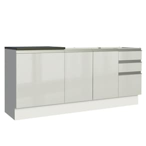 O acabamento da estrutura é branco fosco e as portas e frentes são em branco brilhante. É feito em Pintura Poliéster ecológica de alta resistência, que confere maior durabilidade e durabilidade ao móvel e oferece proteção contra os efeitos da água e do calor.