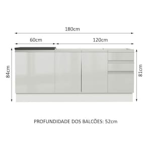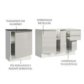 O balcão maior possui 120 cm de largura, com três portas e duas gavetas, além de espaço para pia de inox ou pedra no tamanho de 120 x 52 cm. O outro balcão possui 60 cm de largura, conta com uma porta e acompanha tampo.