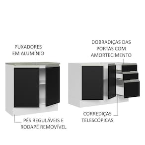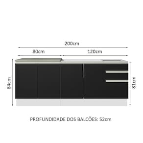 O balcão maior tem 120 cm de largura, com duas portas e três gavetas. Além disso, possui espaço para colocação de pia de inox ou pedra, na medida de 120 x 52 cm. O outro balcão possui 80 cm de largura, conta com duas portas e o tampo pode ser recortado para instalação de cooktop.