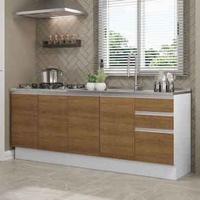 O acabamento da estrutura é branco e o das portas e frentes das gavetas é em amadeirado Rustic. É feito em Pintura Poliéster ecológica, com 7 camadas que protegem o móvel dos efeitos do álcool da água e do calor.