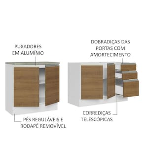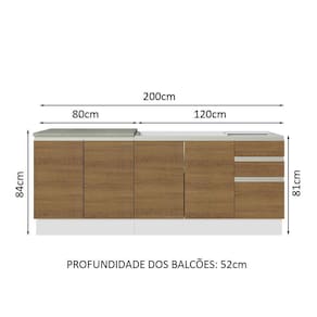 O balcão maior tem 120 cm de largura, com duas portas e três gavetas. Além disso, possui espaço para colocação de pia de inox ou pedra, na medida de 120 x 52 cm. O outro balcão possui 80 cm de largura, conta com duas portas e o tampo pode ser recortado para instalação de cooktop.