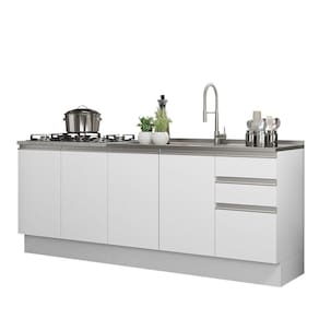 O acabamento dos móveis é branco, feito em Pintura Poliéster ecológica, com 7 camadas que protegem o móvel dos efeitos do álcool da água e do calor.