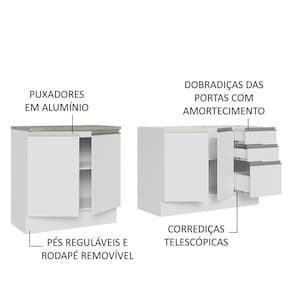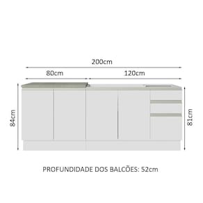 O balcão maior tem 120 cm de largura, com duas portas e três gavetas. Além disso, possui espaço para colocação de pia de inox ou pedra, na medida de 120 x 52 cm. O outro balcão possui 80 cm de largura, conta com duas portas e o tampo pode ser recortado para instalação de cooktop.