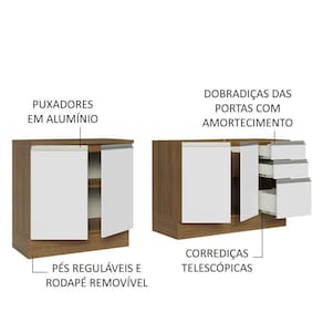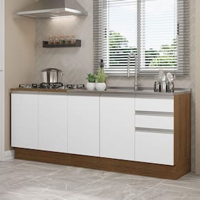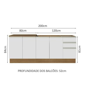 O balcão maior tem 120 cm de largura, com duas portas e três gavetas. Além disso, possui espaço para colocação de pia de inox ou pedra, na medida de 120 x 52 cm. O outro balcão possui 80 cm de largura, conta com duas portas e o tampo pode ser recortado para instalação de cooktop.