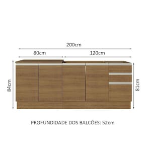 O balcão maior tem 120 cm de largura, com duas portas e três gavetas. Além disso, possui espaço para colocação de pia de inox ou pedra, na medida de 120 x 52 cm. O outro balcão possui 80 cm de largura, conta com duas portas e o tampo pode ser recortado para instalação de cooktop.