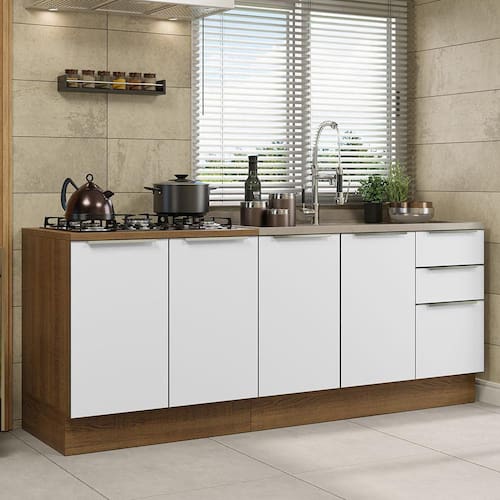 O acabamento da estrutura é em amadeirado Rustic e as portas e frentes das gavetas são em Branco Veludo. É feito em Pintura Poliéster ecológica, com 7 camadas que protegem o móvel dos efeitos do álcool da água e do calor.